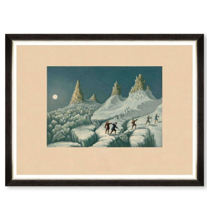 The Frame The Ascent Of MontBlanc II FA13478 is part of an impressive collection that represents unique images resembling scenes from a vintage fairytale book, telling the story of a group of hikers heading towards the summit of the Alps. It is printed on high-quality fine art paper and features a wooden frame. It comes with special protective glass and metal accessories for hanging. There may be a deviation of 3-5cm in the mentioned dimensions due to the uniqueness of the product. Combine it with the other frames in the series and create an impressive composition for the wall of your home or business.