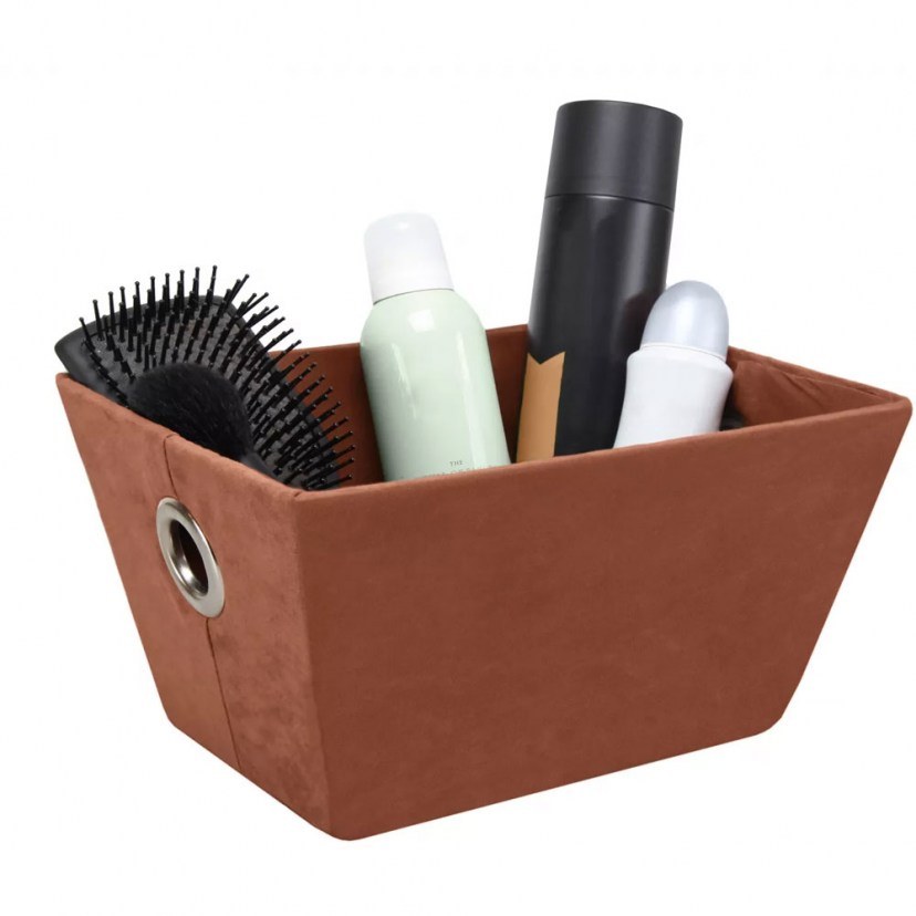 Organize various small items, towels, cosmetics, personal care products, etc. with the help of the Suede M Storage Basket! It is a beautiful basket, covered with polyester fabric, which impresses with its pleasant suede texture and modern design. It has metal handles, making it practical and durable. Quality: Polyester Dimensions: 1 Basket: Length: 27 cm, Width: 15 cm, Height: 20 cm