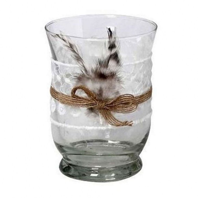 The UNA218K4 Feather Candle Holder is a unique decorative addition to make the atmosphere of your space more pleasant and light. It is a glass candle holder, decorated with lace ribbon and colorful feathers. Quality: Glass. Dimensions: 1 Candle Holder: Diameter: 9 cm, Height: 11 cm.