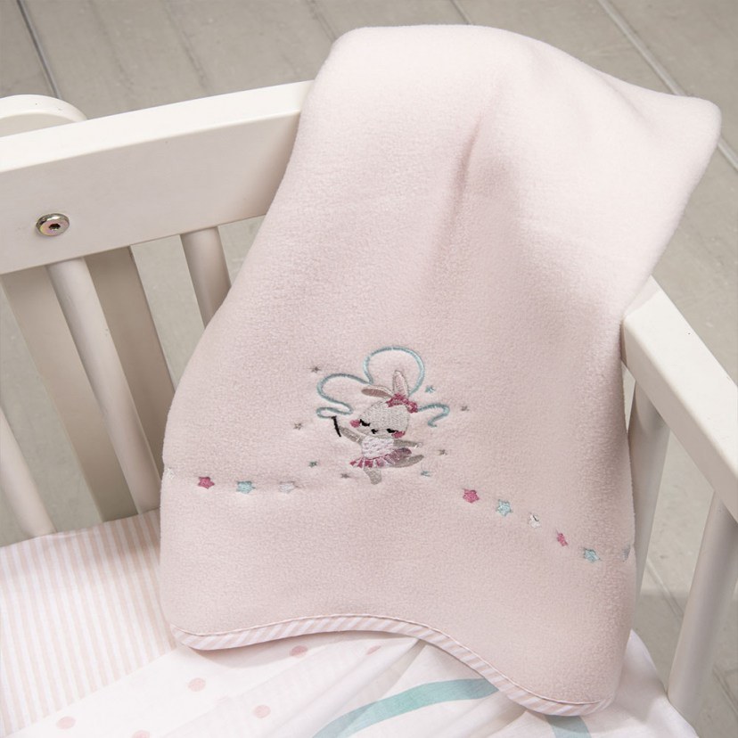 Αγκαλιάστε το μωράκι σας με ζεστασιά και απαλότητα χάρη στη Βρεφική Κουβέρτα Fleece Ballet Bunny από Microfiber 300 gsm. Το εξαιρετικά απαλό και ανθεκτικό ύφασμα προσφέρει άνεση και τέλεια εφαρμογή, ενώ εξασφαλίζει ήρεμο, ξεκούραστο ύπνο. Το παστέλ χρώμα και το χαριτωμένο κεντητό λαγουδάκι-μπαλαρίνα προσδίδουν παιχνιδιάρικη και ρομαντική πινελιά, ενώ το περιμετρικό τελείωμα με ρέλι ολοκληρώνει την κομψή εμφάνιση.