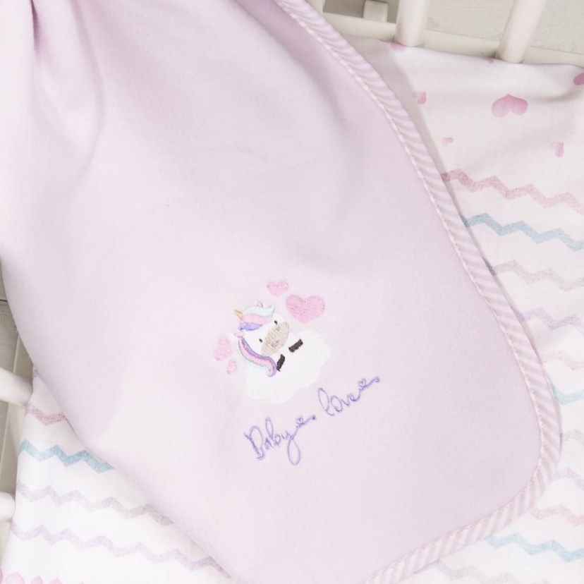 Χαρίστε στη μικρή σας πριγκίπισσα τον άνετο και γαλήνιο ύπνο που έχει ανάγκη με τη Βρεφική Κουβέρτα Fleece Luni Uni. Με κεντημένο τρυφερό σχέδιο μονόκερου και βαμβακερό ρέλι περιμετρικά, θα δημιουργήσει μία παραμυθένια και τρυφερή ατμόσφαιρα. Κατασκευασμένη από microfiber fleece 300 gsm, προσφέρει υπέροχη απαλότητα, ζεστασιά και αντοχή στις συχνές πλύσεις.