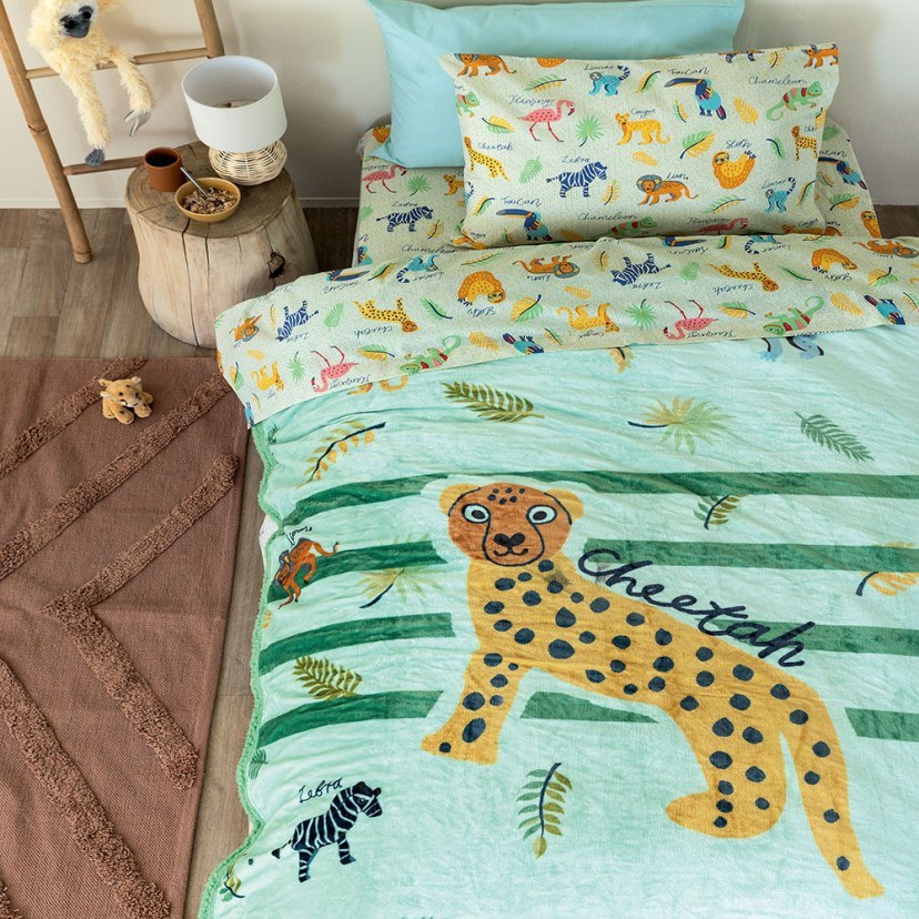 The Children's Blanket SW100 will make your child crazy because of the cute designs with the cheetah and other sweet animals. It is made of polyester fleece flannel sherpa fabric, which makes it warm, comfortable, soft and durable for daily use. Washable at 30°C. Do not iron, tumble dry, dry clean, strong bleach and chlorine.