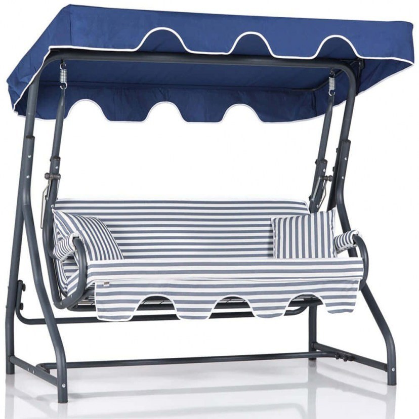 The Olea 3-Seater Garden Swing has an impressive striped design in modern shades. Its ergonomic design, together with the comfortable pillows, ensures ultimate relaxation, allowing you to fully rest after a long day. Constructed with a sturdy metal frame, the swing offers excellent durability and stability, ideal for long-term use. The high-quality polyester fabric is fade and weather resistant, ensuring that the swing stays in top condition all year round. It has a comfortable seat filled with 18 DNS foam and polyester fabric lining, offering unparalleled comfort and support. It is ideal for relaxing and enjoying your outdoor space in style and pleasant comfort. It can withstand up to 240 kg.