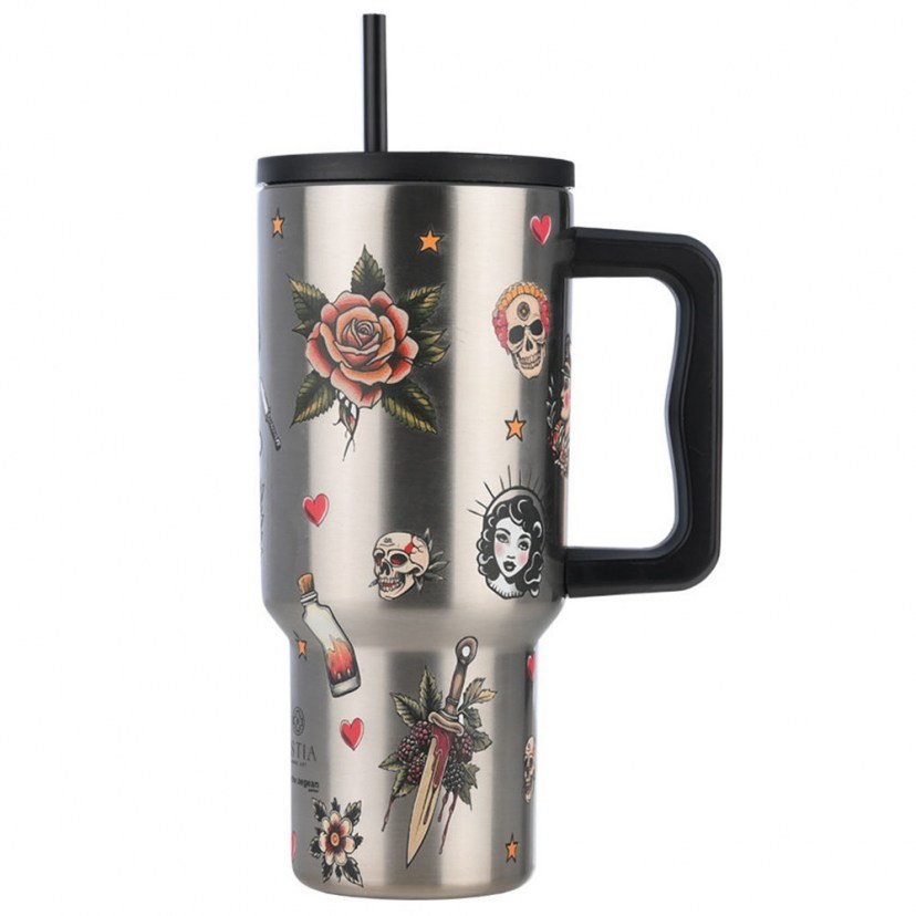 Η Κούπα - Θερμός Με Καλαμάκι Old School Ink Tumbler XL είναι ένας καθημερινός σύμμαχος με ξεχωριστό χαρακτήρα, σχεδιασμένος για όσους θέλουν να ξεχωρίζουν, να απολαμβάνουν τα ροφήματά τους στη σωστή θερμοκρασία και να στηρίζουν έναν πιο βιώσιμο τρόπο ζωής. Κατασκευασμένη από ανοξείδωτο ατσάλι 18/8, εξασφαλίζει υγιεινή χρήση, ανθεκτικότητα και αναλλοίωτη γεύση. Η διπλή μόνωση διατηρεί τα ροφήματά σας δροσερά έως 12 ώρες και ζεστά έως 6 ώρες, καθιστώντας την ιδανική για κάθε εποχή και περίσταση. Διαθέτει εργονομική λαβή, spill-proof καπάκι και επαναχρησιμοποιούμενο καλαμάκι, για άνεση και πρακτικότητα στην καθημερινότητα.