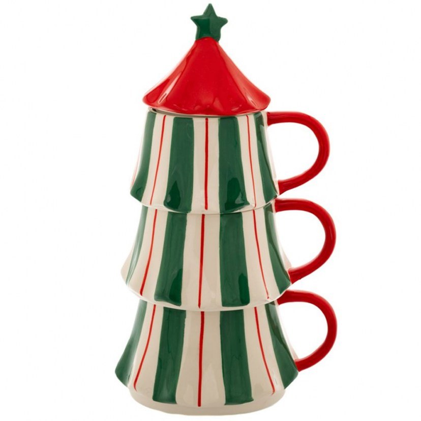 Δημιουργήστε γιορτινή ατμόσφαιρα με τις Σετ Χριστουγεννιάτικες Κούπες Έλατο (3Τμχ) 86922. Πρόκειται για κεραμικές ριγέ κούπες που στοιβάζονται και δημιουργούν το σχήμα χριστουγεννιάτικου δέντρου, προσφέροντας έναν παιχνιδιάρικο και πρωτότυπο τρόπο παρουσίασης. Το σετ αποτελείται από τρεις κούπες.