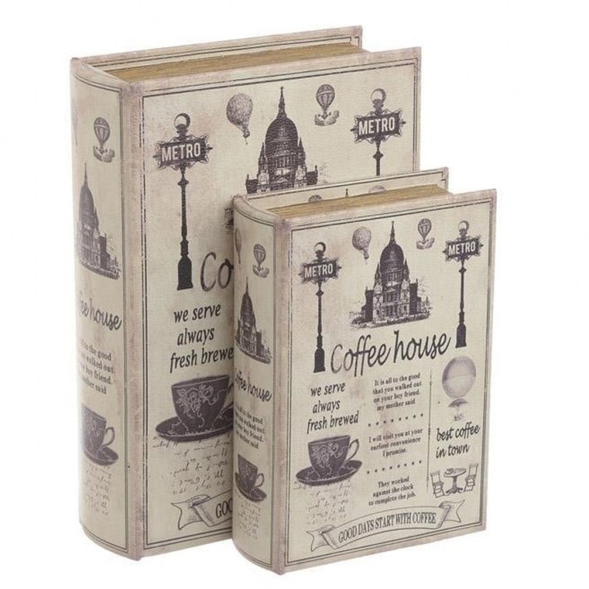 Το Σετ Κουτιά - Βιβλία 3-70-106-0036 Coffee House αποτελείται από δύο κουτιά σε σχήμα βιβλίου, τα οποία είναι κατασκευασμένα από ξύλο σημύδας και επενδυμένα με PU. Μπορείτε να τα τοποθετήσετε στα ράφια της βιβλιοθήκης σας μαζί με τα υπόλοιπα βιβλία σας και να λειτουργήσουν ως κρυψώνα για πολύτιμα αντικείμενα.