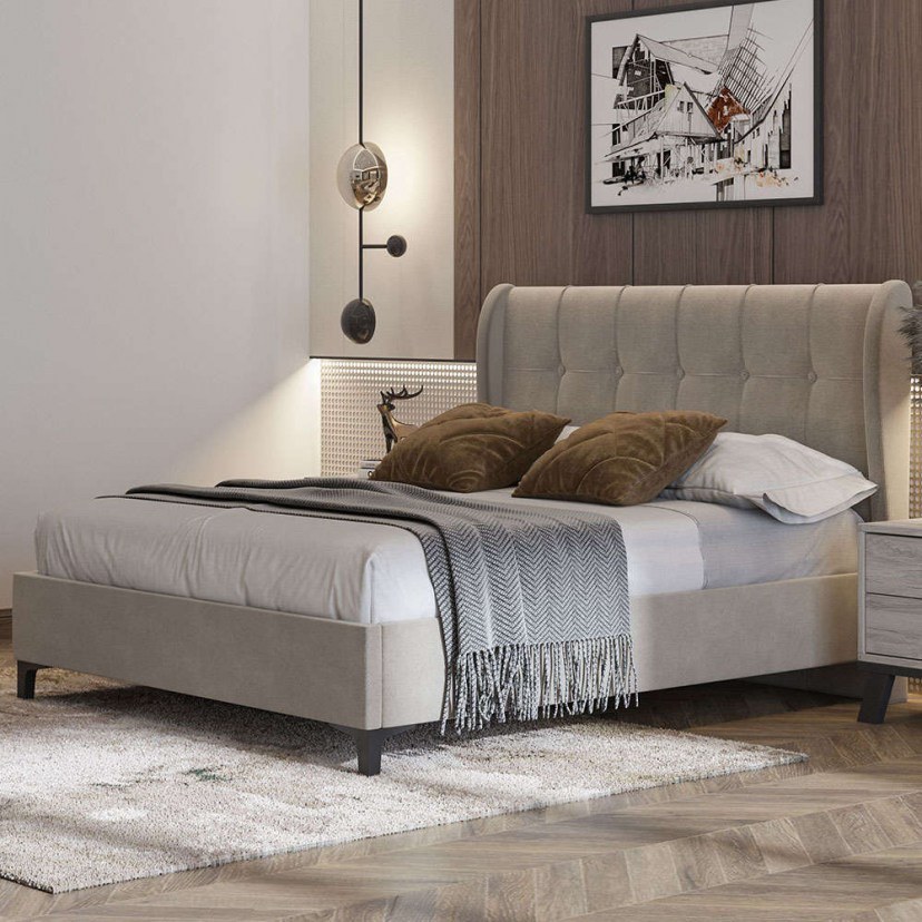 The aristocratic design, high quality, and unbeatable price make Bed No84 a favorite choice of our customers! It is an impressive and eccentric bed with a unique headboard, featuring a tufted design with decorative buttons and side details. It is a durable bed with a sturdy frame made of MDF and melamine, elegantly elevated in the space with wooden legs. The product is delivered unassembled. Slats and mattress are not included. Quality: Melamine & Fabric & Wood & MDF Dimensions: 1 Bed: Length: 150 cm, Width: 200 cm, Height: 120 cm