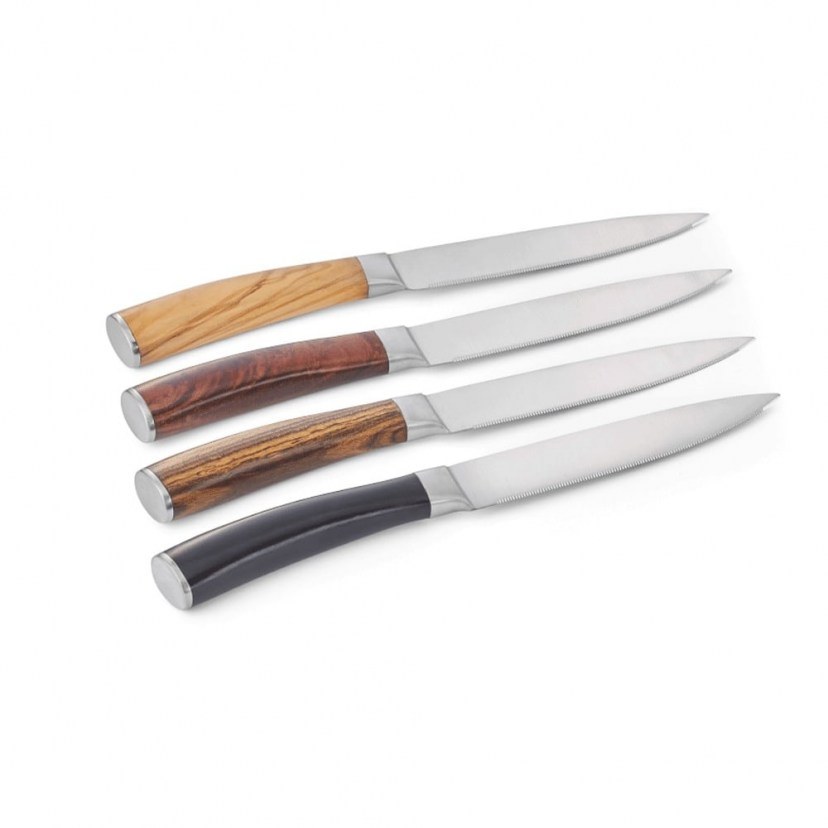 The Garry 353002 Meat Knife Set combines excellent quality and unique style for meat lovers. The four elegant knives feature different wooden handles with unique grains, offering both practicality and aesthetics to your table. The extra sharp size of the stainless steel blade ensures flawless performance, making them ideal for steaks and other meats. The set comes in a premium black gift box, making it the perfect gift for any gourmet meat lover.