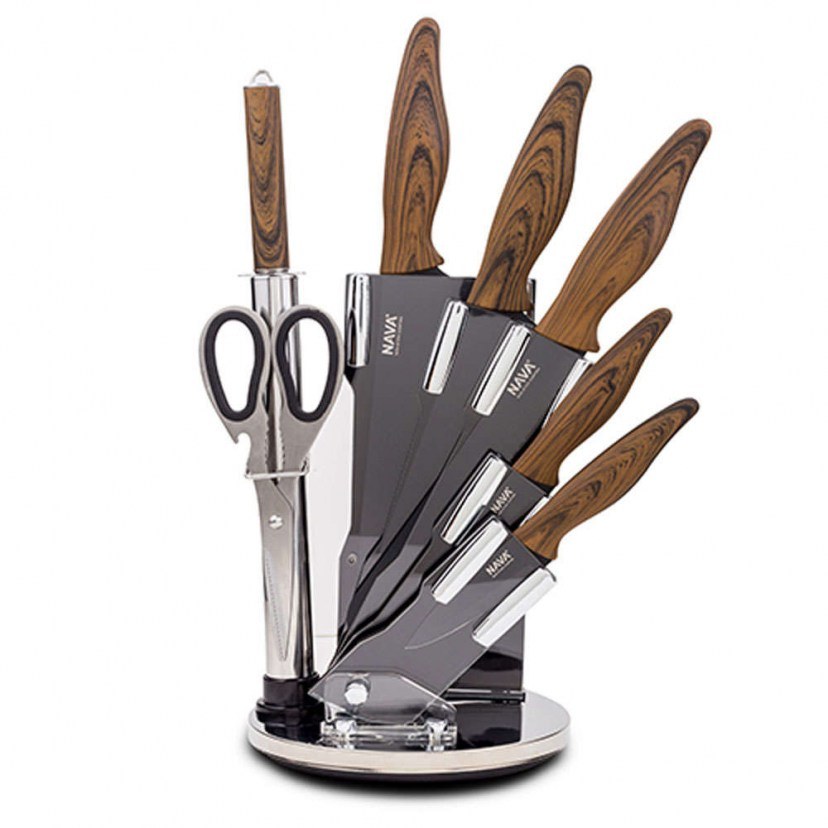 Make the Knife Set In Base (8Pcs) 10-167-004 yours and you will be completely satisfied with your choice. The knives are made of stainless steel with a stone non-stick coating. The set consists of a cleaver, a chef's knife, a bread knife, a utility knife, a paring knife, a masher, a kitchen scissors, and the acrylic base, which offers 360° rotation. It is dishwasher safe. Make it yours at an extremely low price with a click on designdrops. Quality: