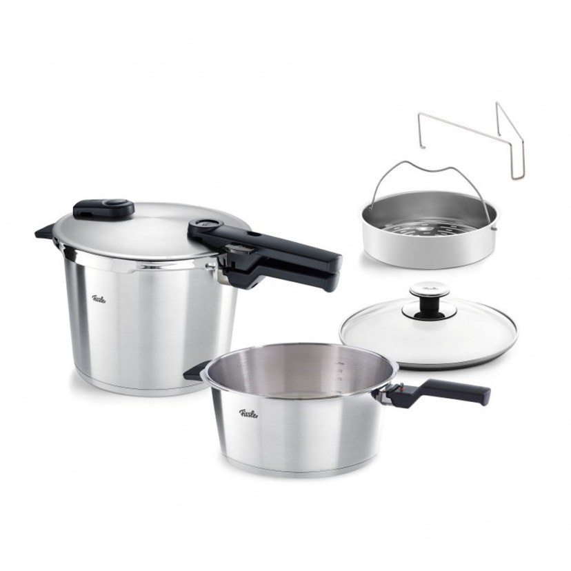 Ανακαλύψτε την απόλυτη ευκολία στο μαγείρεμα με το Σετ Μαγειρικά Σκεύη Quattro Vitaquick Premium 602-410-13-090/0 και μαγειρέψτε γρήγορα, υγιεινά και με απόλυτη ασφάλεια. Το σετ περιλαμβάνει χύτρα ταχύτητας 6Lt και κατσαρόλα 3,5Lt, καλάθι ατμού, τρίποδο και γυάλινο καπάκι, προσφέροντάς σας ευελιξία για κάθε συνταγή, από αργό έως γρήγορο μαγείρεμα με δύο ρυθμίσεις πίεσης. Με πατενταρισμένο σύστημα ασφαλείας, ένδειξη κλειδώματος, λειτουργία αποσυμπίεσης στη λαβή και σήμανση μέτρησης υγρών, σας εξασφαλίζει άνεση και έλεγχο σε κάθε βήμα. Η βιώσιμη κατασκευή από έως και 90% ανακυκλωμένο ανοξείδωτο ατσάλι 18/10 με σατινέ φινίρισμα και η ενεργειακά αποδοτική βάση Superthermic εγγυώνται ομοιόμορφη κατανομή θερμότητας και συμβατότητα με όλες τις εστίες, ακόμη και τις επαγωγικές. Με 10 χρόνια εγγύηση για τα ανοξείδωτα μέρη, επενδύετε σε ένα διαχρονικό, ποιοτικό σύμμαχο που θα αναβαθμίσει την κουζίνα σας. Είναι ασφαλές για πλυντήριο πιάτων χωρίς τα αφαιρούμενα μέρη.