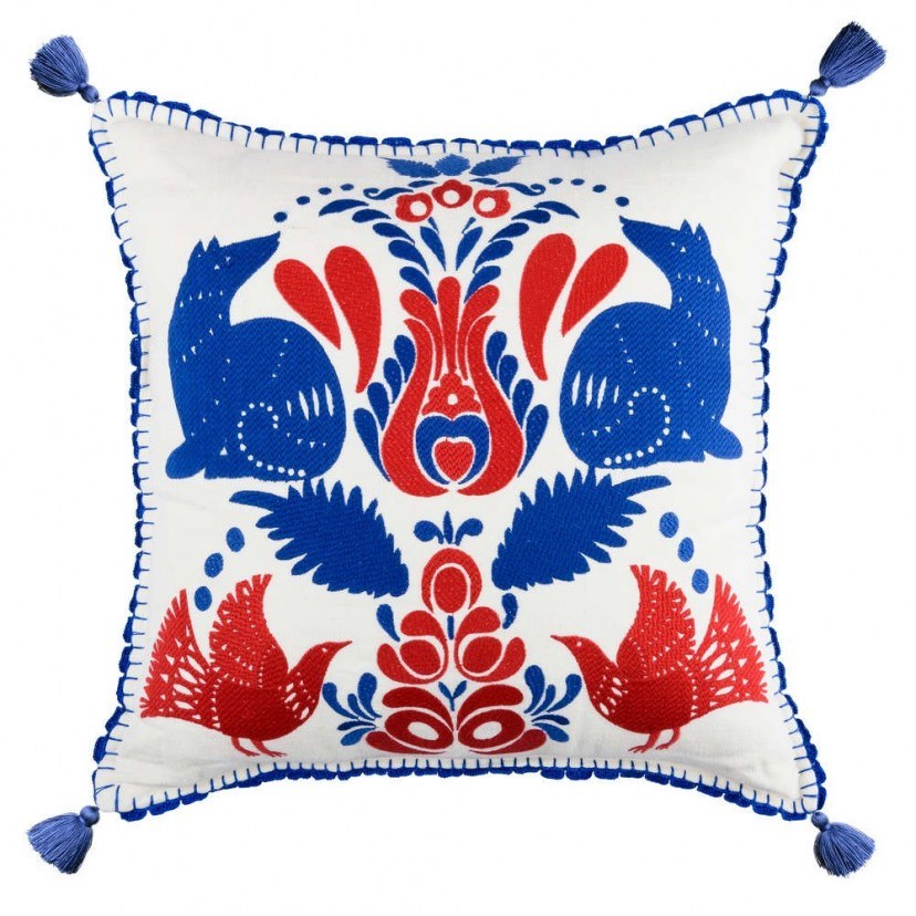 The Folk Embroidery LC40080 Decorative Pillow incorporates tradition in every way, highlighting two important symbols for the culture of Transylvania: the fox and the bird. It features an impressive embroidery on the front and a white monogram M on the back. It has handmade cotton lace around the edges and blue cotton tassels on the corners. It has a rich filling of duck feathers, which ensure a delightful and fluffy texture. Designed in England. Dry clean only. Washing, bleaching, and tumble drying are prohibited. The product is imported exclusively for you from abroad, so there may be delays in delivery time. Quality: Linen lining, Duck feather filling. Dimensions: 1 Decorative Pillow: 50x50 cm.