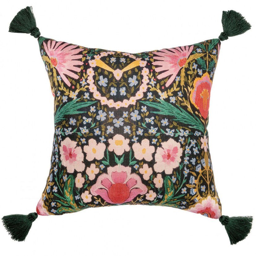 Pink flowers and circular chains made of flowers representing symbols of peace adorn the Susie Q LC40147 Decorative Pillow. Bringing a quirky yet elegant feel to the print, the enticing pink, yellow, and green colors bring joy to any interior space. The four dark green cotton tassels give the pillow a sophisticated silhouette while complementing the tones within the print itself. This is a high-quality pillow that features a fabric lining with a stonewashed finish. It has a rich filling of duck feathers, which provide a delightful and fluffy texture. Dry clean only.