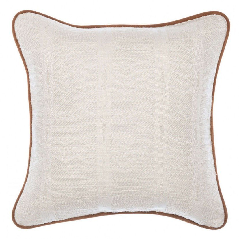 The White Lake Jacquard Decorative Pillow LC40167 got its name from the white sand of the beaches. The textured weave includes forms depicting waves and water movement, bringing a subtle depth to the surface, reminiscent of the lake itself. This monochrome jacquard design pillow is complemented by a contrasting brown suede edge. It is a high-quality pillow that features a rich filling of duck feathers, providing a luxurious and fluffy texture. Dry clean only.