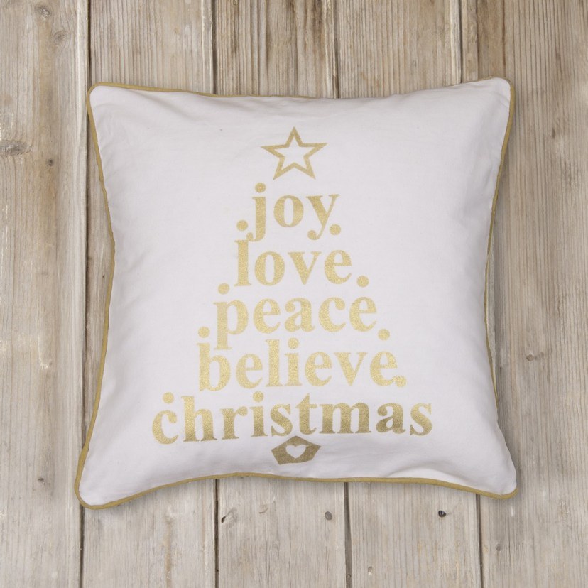 Προσθέστε στο σπίτι σας μια ζεστή και γιορτινή νότα με τη Διακοσμητική Χριστουγεννιάτικη Μαξιλαροθήκη Peace, κατασκευασμένη από 100% βαμβάκι με εκτύπωση golden foil. Το απαλά υφασμένο φυσικό ύφασμα συνδυάζει άνεση, ανθεκτικότητα και μαλακή υφή, ενώ το λαμπερό τύπωμα golden foil αποτυπώνει τις λέξεις Joy, Peace, Love, Believe και Christmas, προσφέροντας πολυτελή και εορταστική αίσθηση. Με ουδέτερο φόντο που ταιριάζει εύκολα σε κάθε διακόσμηση, η μαξιλαροθήκη Peace αποτελεί κομψό διακοσμητικό στοιχείο για το σαλόνι, την πολυθρόνα ή το κρεβάτι σας κατά τη διάρκεια των γιορτών.