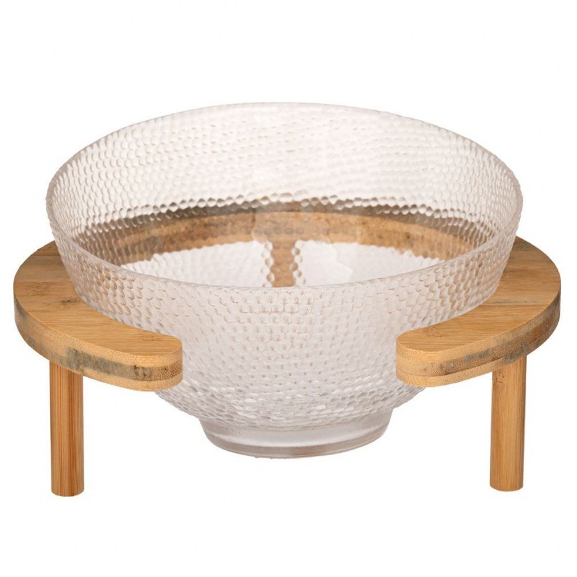 Το Μπωλ Σε Ξύλινη Βάση 8831 συνδυάζει τη φυσική ζεστασιά του ξύλου με την κομψότητα του διαφανούς γυαλιού, δημιουργώντας ένα ιδιαίτερο διακοσμητικό και πρακτικό κομμάτι για το τραπέζι ή τον μπουφέ σας. Το γυάλινο μπολ αναδεικνύει με στυλ φρούτα, σνακ ή διακοσμητικές συνθέσεις, ενώ η σταθερή ξύλινη βάση προσδίδει rustic φινέτσα και σιγουριά στη χρήση. Ιδανικό για όσους αγαπούν τη φυσική αισθητική και θέλουν να προσθέσουν μια μοντέρνα πινελιά στον χώρο τους.