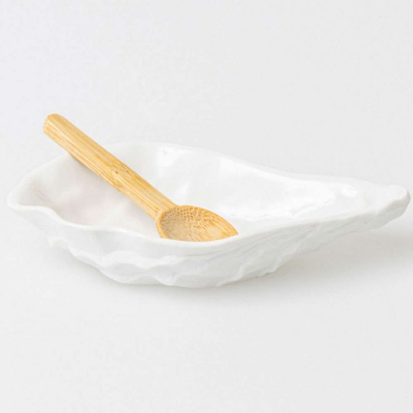 The Oyster Shell Serving Bowl Set (2Pcs) RD0017365 is ideal for serving dip & chutney. It is designed in an impressive oyster shape and is made of quality porcelain with an inner glass lining. There is also a bamboo spoon in the package. Quality: