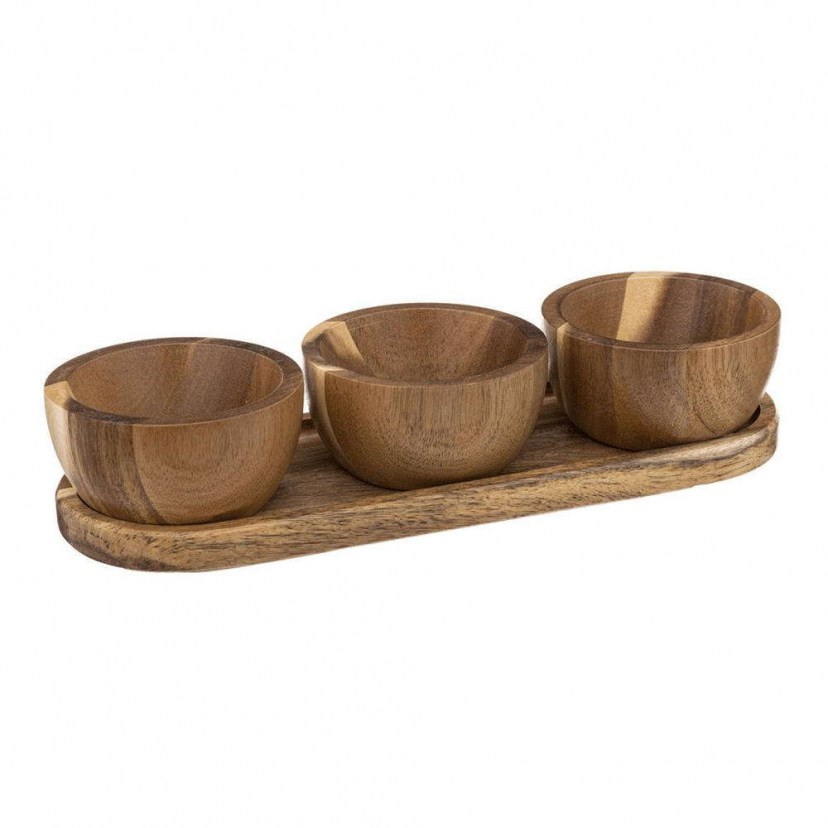 The Ornerbier 3-Seater Set with Base (4 Pieces) 07.188886 is ideal for those who love rustic aesthetics. It is made of durable acacia wood and has a beautiful design. You can use it to serve sauces or other foods. The set consists of three bowls and a base.