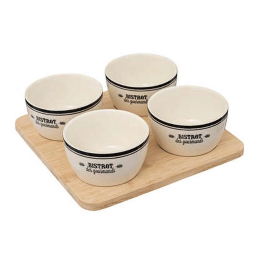 The Bistrot 4-Seater Set (5Pcs) 07.196424 was designed to serve various foods such as chips, nuts and cut fruits or vegetables to your guests. The set consists of a wooden base and four bowls with a beautiful vintage design. Quality: