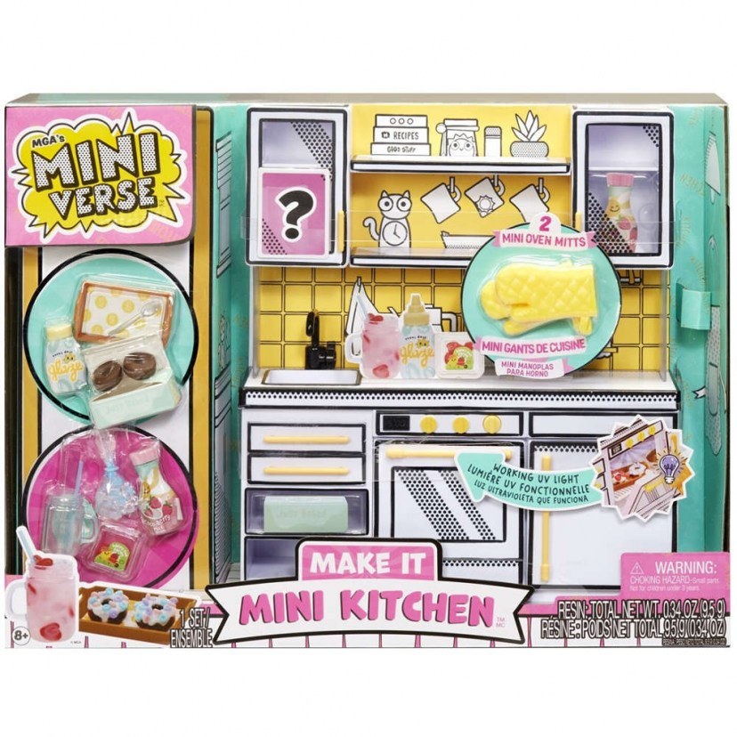 Welcome to food culture in style and creativity with the Miniverse 591832EUC Miniature Kitchen Playset. This collectible toy is designed to prepare, set and present all your creations, be it mini snacks or sweets! Miniverse is the first mini collectible that allows you to prepare, shape and display your own mini creations. Each Mini Kitchen set includes realistic mini food packaging and kitchen accessories to make mini replicas of your favorite snacks and desserts. It includes an oven, fridge, counter and shelves for a mini cooking experience and comes with a mini multipack of food and accessories. Includes mystery ingredients, exclusive mini oven mitts and 2 bonus recipes. Complete your creation and use the functional UV light to set, revealing realistic mini culinary creations. Requires three AA batteries, which are not included. Features: