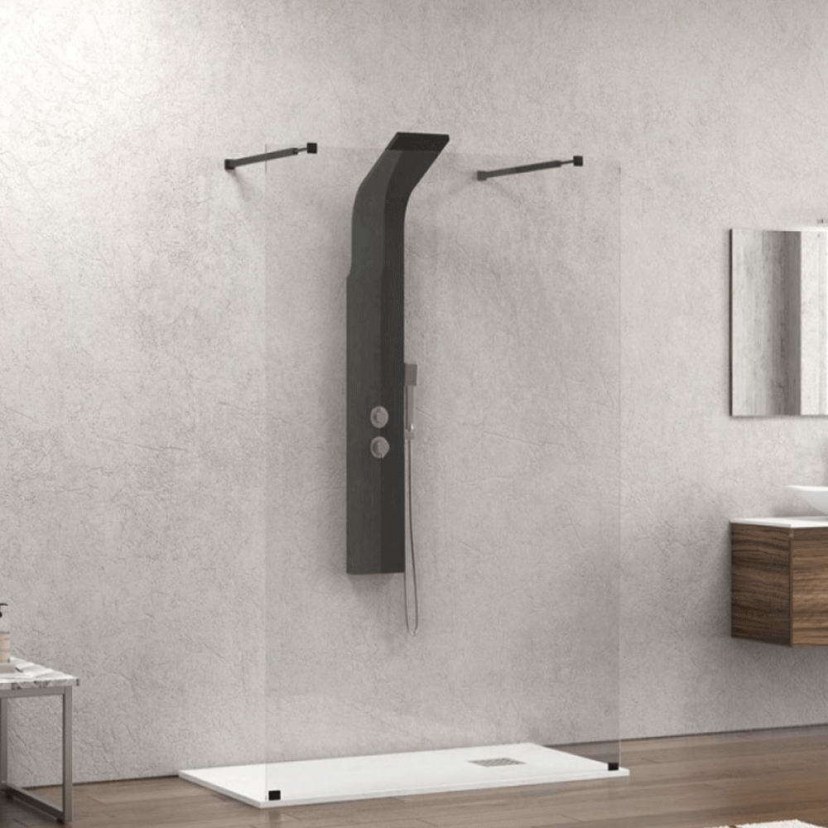 The Fixed Walkin Shower Panel 3 features a 8mm thick safety glass surface and is supported by an anodized aluminum frame. It includes two large telescopic rods measuring 70-120 cm and a synthetic crystal sealing profile that is placed on the floor. It has a floor stabilizer and offers the possibility of reversal. For cleaning the metal parts of the cabin, use only water and a soft cloth.