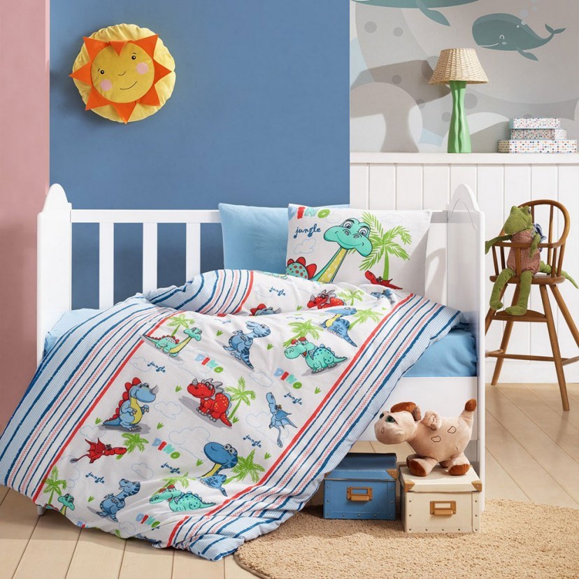 The Dino Baby Duvet Cover Set is ideal for offering your baby a magical and comfortable sleep! With a playful design full of dinosaurs and other cute motifs in cheerful hues, this set will light up your baby's room with joy and vibrancy. Made from ranforce cotton, the fabric is incredibly soft and friendly to your little one's sensitive skin, ensuring a luxurious touch and a comfortable sleep. The set includes a duvet cover, a sheet and two pillowcases, to cover all his bed needs.