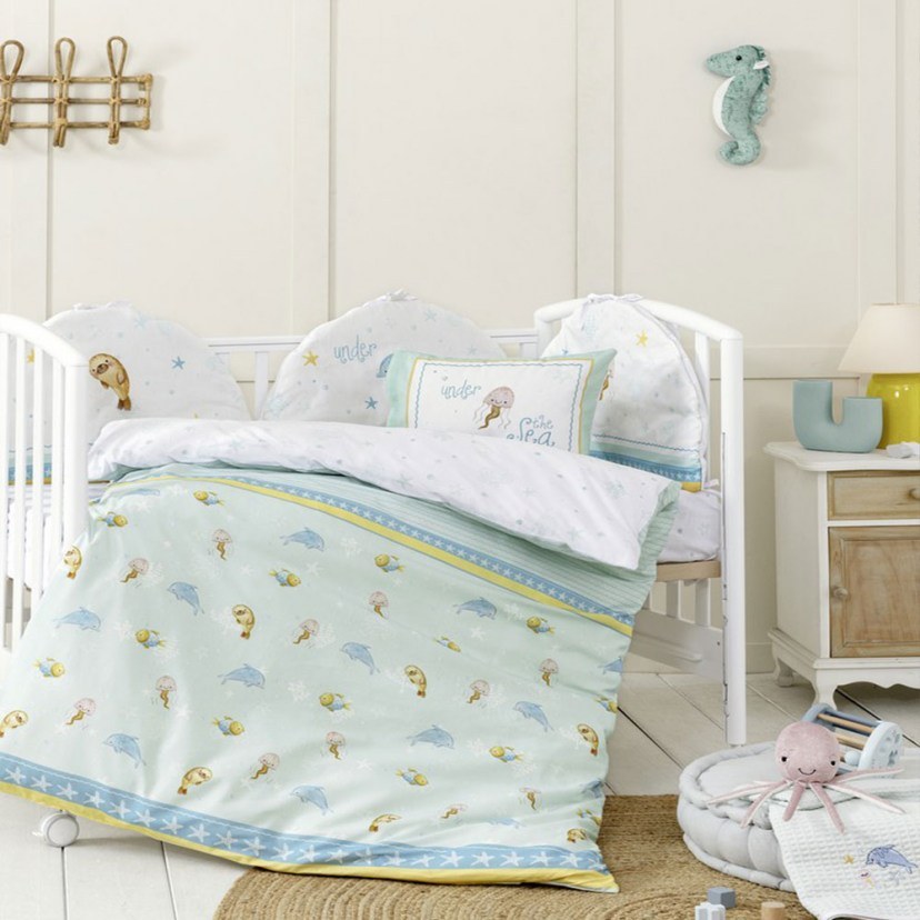 Get the Sea Love Baby Duvet Cover Set (2pcs) from designdrops and give your baby a comfortable and peaceful sleep. It has cute designs with sea animals, which will drive your little angel crazy. Its natural composition of 100% cotton 144 threads, makes it breathable, hypoallergenic, soft, durable, antistatic and friendly to your baby's sensitive skin. The set consists of a duvet cover and a pillowcase.