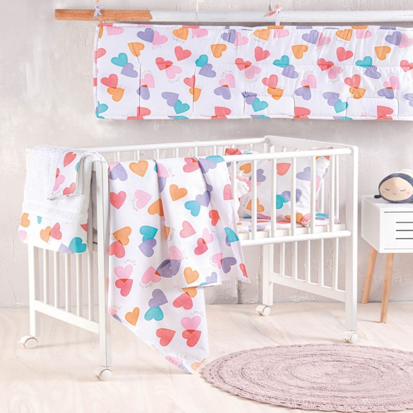Make your baby's crib more beautiful and lovelier than ever with the beautiful Zoey Baby Duvet Cover Set. It has an impressive design with colorful hearts in pastel shades, creating a unique aesthetic effect. Made from pure cotton yarn, this set offers a soft feel and comfort to your baby, while also being designed to provide safety and well-being. The high quality of its materials ensures a long life and durability, while the vivid colors remain bright even after multiple washes. Quality: