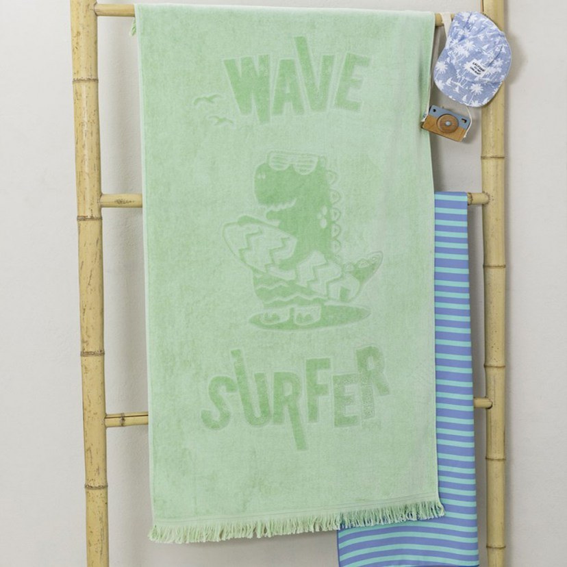 The Kids' Surf Jacquard Beach Towel is the number one choice for your child's summer adventures at the beach. It has a cute design with a surfer dinosaur that will become your child's best friend. Made of 100% cotton with velor treatment and jacquard weave, it offers incredible softness, absorbency and excellent durability, while being friendly to sensitive children's skin.