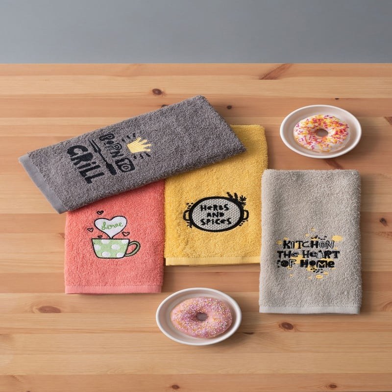 KT150 kitchen kitchen sets consists of four modern towels, with modern embroidery and wonderful shades. They are made of cotton fabric, which makes them pleasant in texture, durable and use and absorbent. Washing at 30 ° C, without the use of chlorine or other whitening. Dryer and dry cleaning are prohibited. Ironing with a maximum temperature of 150 ° C. Make this set from designdrops and take advantage of the excellent quality and price relationship! quality: