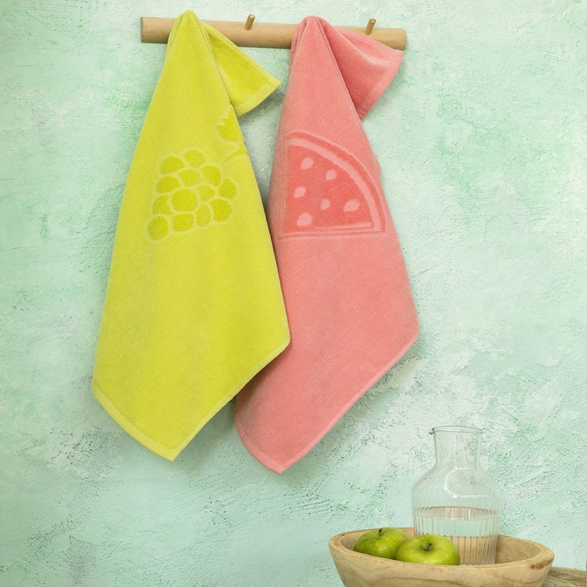 The Kitchen Towel Set Summering includes two monochrome towels with embossed designs of summer fruits. These towels are of excellent quality, made of cotton fabric with jacquard weaving. They are very soft, absorbent, and durable, making them ideal for everyday use.