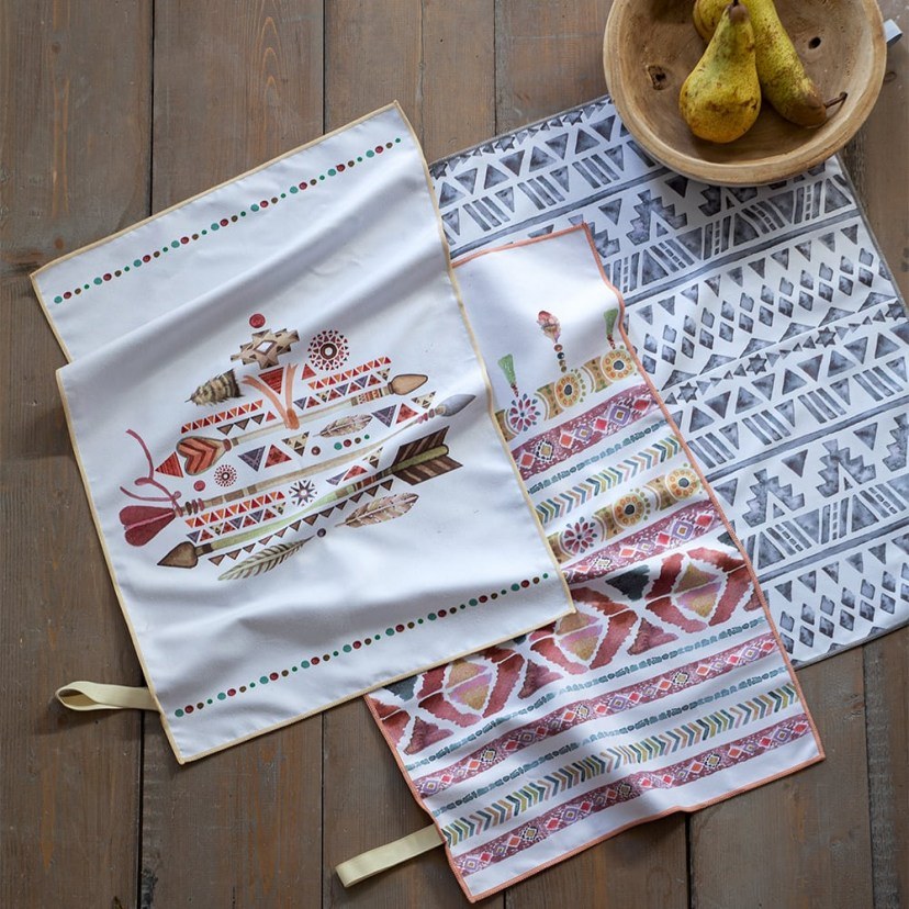 The Zahara Kitchen Towel Set consists of three double-sided towels, with a solid color interior and different ethnic digital prints on the exterior. They are made of microfiber, a fabric with a very dense weave, consisting of extremely fine threads that are equal to or thinner than one denier. Thanks to this special weaving and quick dry technology, they are soft, absorbent, and dry easily. The set is an excellent choice for those who love the boho chic style! Quality: 100% Microfiber. Dimensions: 1 Towel Set: 3 Towels: 40x60 cm.