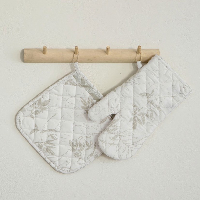 The Foliage Dish and Glove Set decorates your kitchen with a unique minimal floral pattern that depicts nature in a painterly rendering. This wonderful set is a practical and reliable choice for your kitchen. Made of 100% cotton, these two accessories are antistatic, hypoallergenic and have great resistance to time and frequent washing. The glove is designed to fit the hand perfectly, offering comfort and ease of use. The handle, on the other hand, is soft so that it is easy to use, offering the necessary protection for your hands when in contact with hot utensils. Quality: