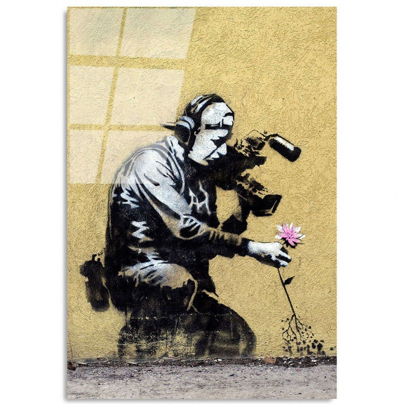 Glass Painting 123BZM1354 represents Bansky's famous work Camera and Flower, which carries a powerful and ironic message. In the illustration, a man kneels on the ground, holding a portable video camera, and tries to capture the beauty of a pink flower up close, but his effort unfortunately results in uprooting it. In this way he highlights the irony of human nature and wants to make us think about the consequences of our actions. Made of 100% tempered glass, this panel ensures long-lasting durability and safety in your space. The 4mm thickness offers extra protection as the tempered glass shatters into small, harmless pieces if broken.