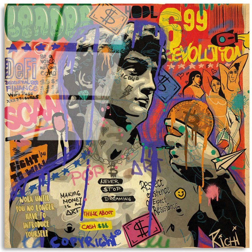 Glass Painting 123BZM2332 is a striking piece of art that stands out with its colorful design, which depicts a statue with various graffiti surrounding it. Made of tempered glass, this painting is not just a decorative choice, but a masterpiece that combines artistry and quality. Printing on the back of the glass panel ensures that the colors remain vivid and true, even after years.