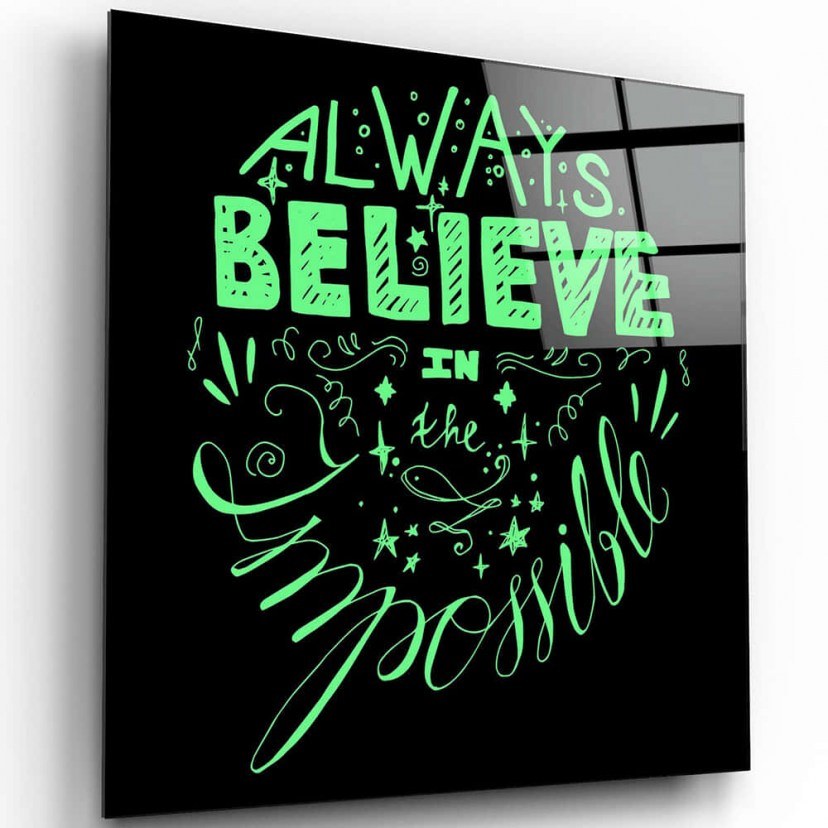 The Glass Board 231MDF2832 features an eye-catching colorful design that represents the phrase "Always Believe in the Impossible". The intense and vibrant shades, combined with the inspiration of the phrase, create an atmosphere of positive energy and invincible belief in our abilities. It is made of tempered glass with a thickness of 4 mm, offering not only aesthetics but also durability. UV printing ensures that colors remain vibrant and true for many years, adding a sense of sophistication and elegance to your space.