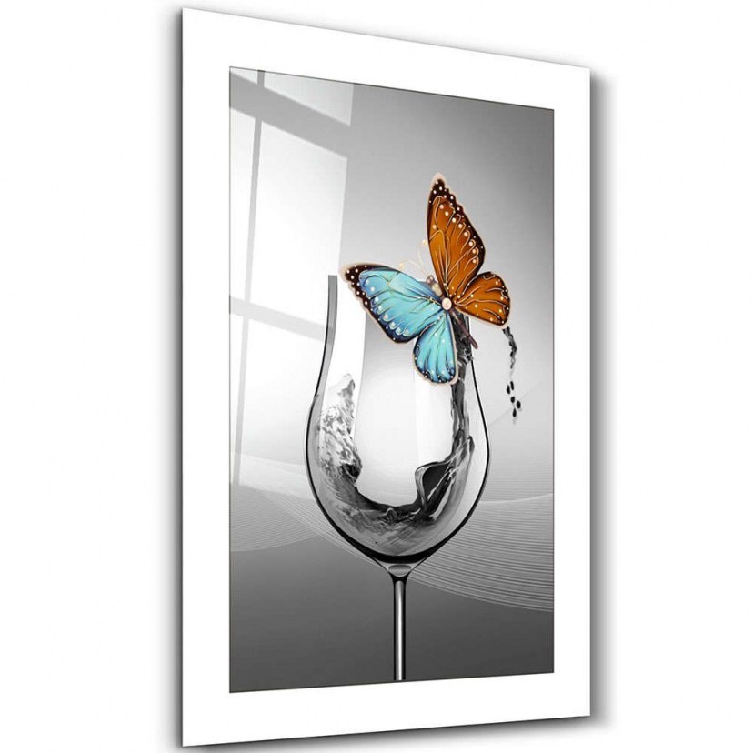 Glass Painting 672BRS1141 depicts a sophisticated scene with a clear columnar glass, on which sits a colorful butterfly. A sense of fragility and airy beauty emerges through the combination of the glass and the butterfly, creating a painting full of sensitivity and euphoria. The colorful butterfly, with its bright colors, creates a strong contrast with the transparency of the glass, while the detailed patterns of the butterfly lend a sense of natural beauty and vibrancy to the work. It is made of high-quality glass with a thickness of 4 mm, to offer unparalleled elegance and durability, ensuring long-term use without losing its aesthetics.