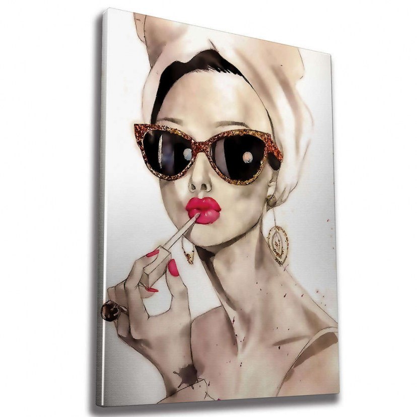 Canvas Painting 227WRZ1144 depicts a beautiful female face with plump lips and trendy sunglasses. This artwork can add a sense of elegance and modern aesthetics to your space, offering a unique aesthetic value. It provides a great atmosphere to the space, as it depicts a modern and striking portrait with feminine features and trendy sunglasses, which will add style and elegance to the wall where you place it. This painting is made with high-quality materials, ensuring its durability and longevity, while its wooden frame adds a touch of elegance and sophistication to the artwork. Quality: