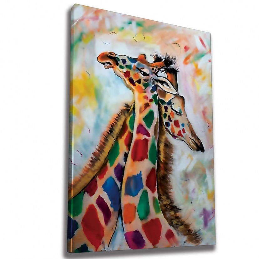 Canvas Painting 227WRZ1197 depicts a tender snapshot of two colorful giraffes. This decorative artwork can add a sense of warmth and joy to your space. The colorful giraffes add a dose of liveliness and joy to the painting, while the tender snapshot captures a moment of intimacy and love between them. This canvas painting can create a pleasant atmosphere in any room of your home and attract the eyes of visitors with its vivid colors and emotional theme. This is a painting digitally printed on high-quality canvas, ensuring vivid colors and intricate details that bring out the character of the work. It features a durable 2x3 cm thick wooden frame, adding a touch of elegance and ensuring the project's longevity. This canvas painting is sure to become the focal point of your space, leaving a lasting impression on all who enjoy it. Quality: