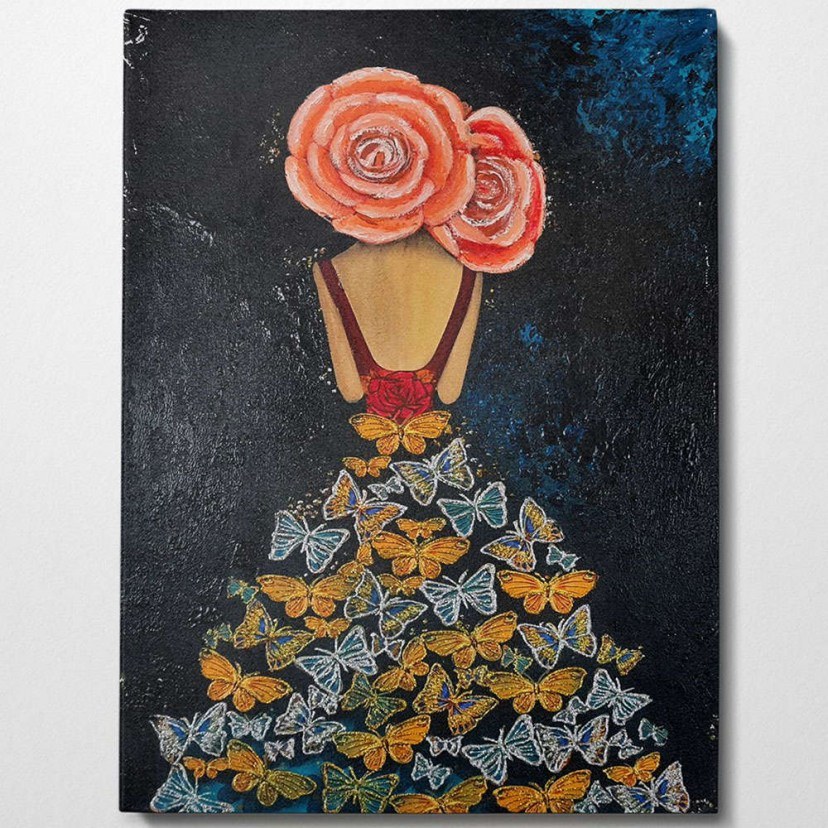 Discover the magic of Canvas Painting 405HND1241, a unique piece of art depicting the back view of a female figure, with flowers on her head and a stunning skirt full of butterflies. This hand-painted creation combines natural beauty with imagination, creating a masterpiece that will steal the show. The attention to detail and vibrant colors of the painting make it a truly unique work of art. Each touch is executed with precision by the talented artist, offering a sense of elegance and sophistication. It is painted on canvas and provides a smooth and durable surface, while the wooden frame adds elegance and stability.