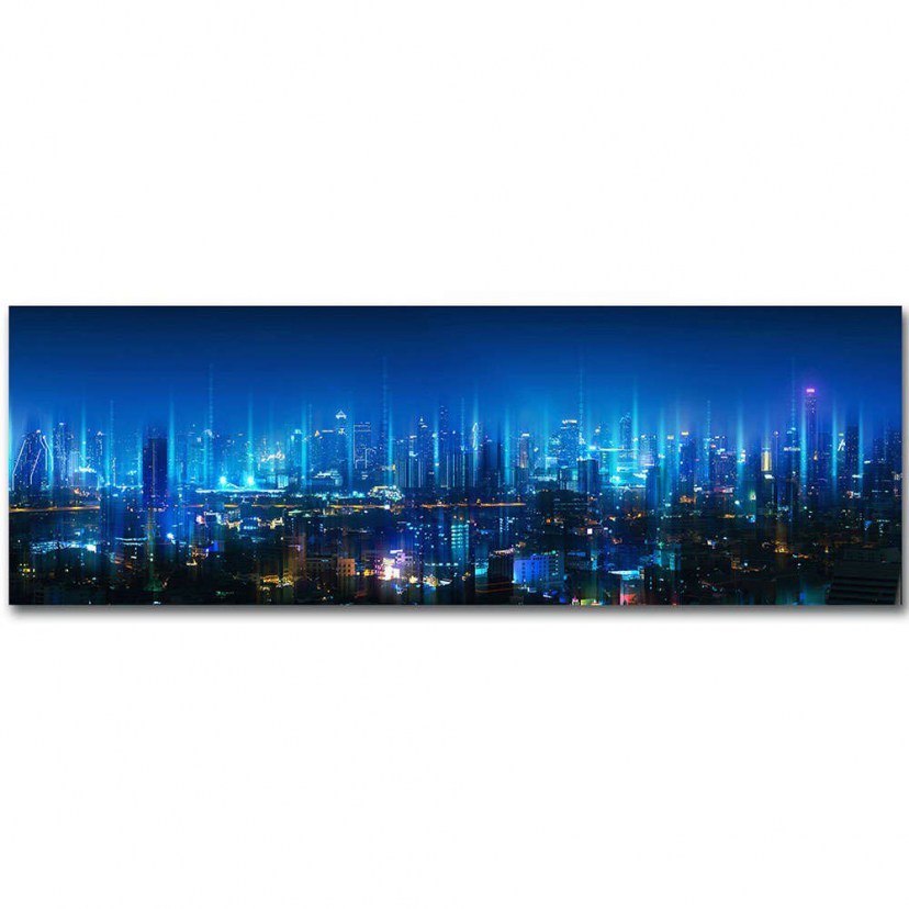 The 254LED4475 LED Illuminated Canvas Print depicts a unique cityscape with tall buildings lit up, capturing the grandeur and energy of the city at night. The lights of the buildings create an impressive atmosphere, while the light reflections on the windows and the geometric lines of the buildings offer a modern and dynamic aesthetic effect. Crafted from suede canvas, the artwork exudes sophistication and timeless beauty, while the wooden frame ensures sturdiness and durability. At 3cm thick, the frame adds depth and dimension, making the painting stand out on your wall. The built-in LED function offers a unique illumination, enhancing the details of the work and creating an atmosphere of warmth and elegance. You can adjust the lights easily via the on/off button. Requires 9 volt battery power, not included.