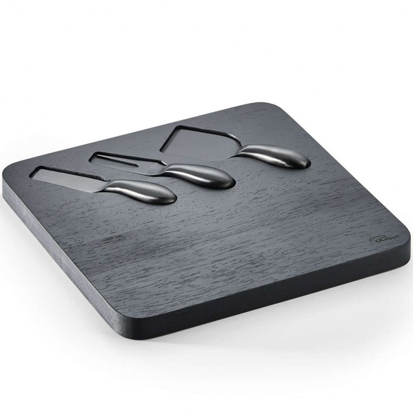 The Fromage 189012 Serving Plate Set With Cheese Knives is ideal for lovers of cheese and fine delicacies. The plate is double-sided, on one side it has three pockets to store the knives, and on the other side it is smooth, but has a groove in the top, where you can place the three serving tools when in use. The sustainably grown blackened rubber provides an elegant contrast to the cheeses served, while the natural grain and color intensity varies slightly in each piece, making it unique. The board is also ideal for serving charcuterie, antipasti or amuse-gueule, adding variety and style to your taste presentations. This wonderful set combines functionality and aesthetics, making it a must-have piece for any table or celebration.