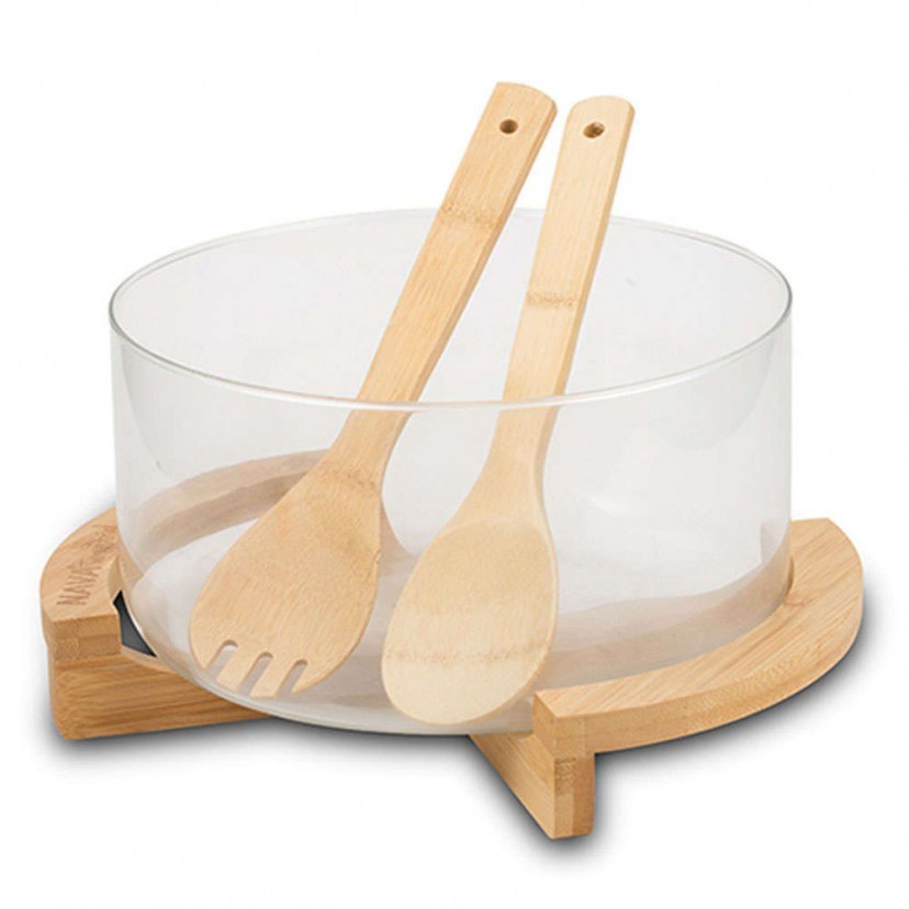 Serve salad, fruits or any other food in the Terrestrial Salad Set with Spoons (4 Pieces) 10-107-013 and impress your guests. It is an ideal choice for both modern and timeless dining rooms. The set consists of the glass salad bowl, two wooden spoons, and the bamboo base. The glass container is dishwasher safe. Quality: