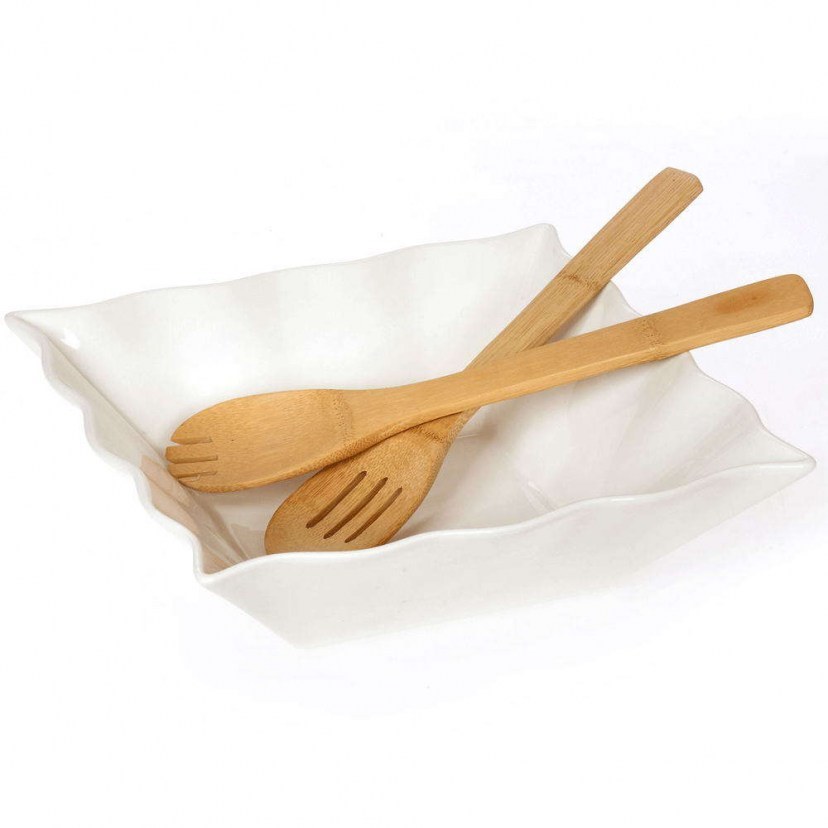 The Bamboo Salad Bowl 26.000.90 will provide classic finesse and ergonomics to your table! It is a porcelain salad bowl, made of fine porcelain that ensures a smooth surface and elegant appearance. It comes with a bamboo spoon and fork for easy serving.