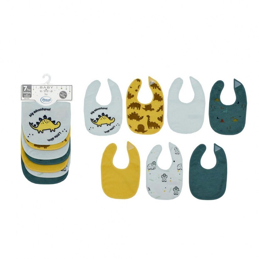 Διατηρήστε το μωράκι σας καθαρό με στυλ με το Σετ Σαλιάρες Dinosaur 08 Με Velcro Και Αδιάβροχη Επένδυση (7τμχ), που συνδυάζει άνεση, πρακτικότητα και χαρούμενα σχέδια με θέμα τοyς δεινόσαυρους. Κάθε σαλιάρα έχει δύο στρώσεις και κλείνει εύκολα γύρω από τον λαιμό με Velcro. Η επάνω στρώση από CVC Terry ύφασμα (60% βαμβάκι, 40% πολυεστέρας, 180 gr/m²) είναι μαλακή, ανθεκτική στη συρρίκνωση και διατηρεί τα χρώματα ζωντανά, ενώ η κάτω στρώση από αδιάβροχο PEVA (90 gr/m²) χωρίς φθαλικές ενώσεις, προστατεύει τα ρούχα από υγρά και λεκέδες. Όλες οι σαλιάρες φέρουν το πιστοποιητικό OEKO-TEX® Standard 100, εξασφαλίζοντας ότι είναι ασφαλείς και φιλικές για το μωρό σας.