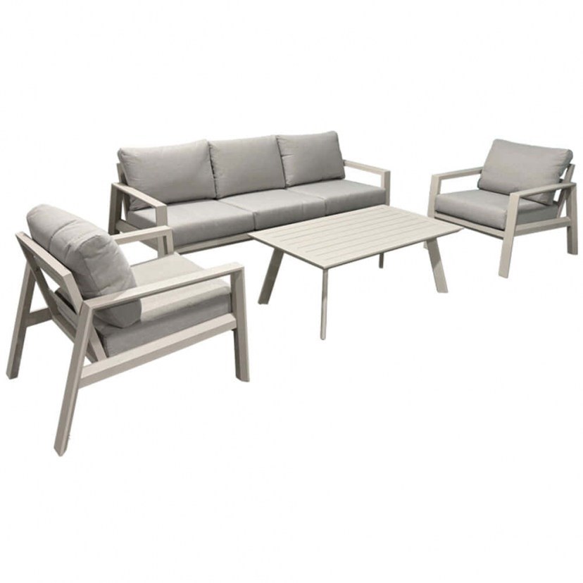Αναβαθμίστε τη βεράντα ή τον κήπο σας με το Σετ Σαλόνι Κήπου Kallisto (4Τμχ) 402-000003, που συνδυάζει μινιμαλιστικό design και διακριτική πολυτέλεια. Με ανθεκτικό αλουμινένιο σκελετό και άνετα μαξιλάρια πάχους 12 cm, προσφέρει ιδανική ισορροπία ανάμεσα στην αισθητική και την πρακτικότητα. Οι καθαρές γραμμές ταιριάζουν αρμονικά σε κάθε εξωτερικό χώρο, δημιουργώντας ένα σύγχρονο και φιλόξενο περιβάλλον για στιγμές χαλάρωσης και φιλοξενίας. Το σετ αποτελείται από ένα τραπέζι, έναν καναπέ και δύο πολυθρόνες. Το προϊόν παραδίδεται αμονταριστο στην εργοστασιακή του συσκευασία με αναλυτικό οδηγό συναρμολόγησης.