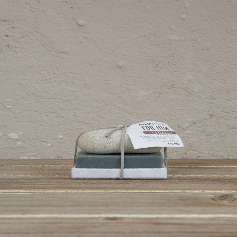 The Handmade Soap Set with Cedarwood Exfoliating Stone includes a soap with a masculine cedarwood scent and an exfoliating stone that are used together to make your skin softer and more youthful. Use the soap by massaging it onto wet skin until lather forms, then make circular motions on areas that need exfoliation with the exfoliating stone, and finally rinse with plenty of water.
