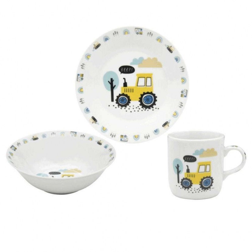 Are you looking for a set that will encourage your child to eat on their own? Then choose the Children's Tractor Dinner Set (3 pieces) LXN08480103. It is made of high-quality porcelain and features a tractor design. It has SGS certification for suitability. The set consists of a shallow plate, a cup, and a bowl. Quality: Porcelain Dimensions: 1 Dinner Set: 1 Shallow Plate: Diameter: 17.8 cm & 1 Serving Bowl: Diameter: 15.2 cm & 1 Cup: Capacity: 230 ml