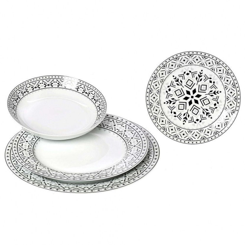 The Nostro Dinnerware Set 25.860.40 is made of fine porcelain, making it durable over time and use. It features a modern design with geometric influences and is available in beautiful shades. It is ideal for everyday use as well as special occasions. The set includes six shallow dinner plates, six deep dinner plates, six dessert plates, one serving platter, and one salad bowl made of high-quality porcelain. Suitable for dishwasher and microwave use.