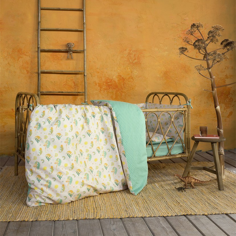 The Cute Chameleon Crib Set impresses with its modern and playful colors, making the nursery more beautiful than ever. The adorable print with chameleons will delight your child! It is made of cotton fabrics, which are completely healthy and friendly to your baby's sensitive skin. The set includes two crib sheets, a pillowcase, a thin blanket, and a protective pad.
