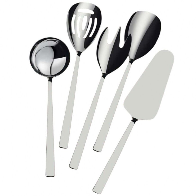 1 Σετ Σερβιρίσματος: 1 Κουτάλα Σάλτσας: Μήκος: 20 cm, Πλάτος: 6 cm & 1 Κουτάλι Σάλτσας: Μήκος: 24 cm, Πλάτος: 4,5 cm & 1Πιρούνι Σάλτσας: Μήκος: 21 cm, Πλάτος: 5 cm & 1 Στραγγιστήρι Σάλτσας: Μήκος: 21 cm, Πλάτος: 5,5 cm & 1 Σπάτουλα Σάλτσας: Μήκος: 24 cm, Πλάτος: 4,5 cm